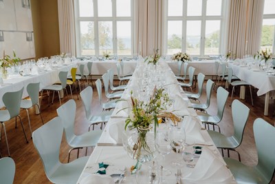 Hotellet byr på flere ulike selskapsrom. Restauranten Himmel og Hav har kapasitet til store arrangementer, mens de mer intime rommene gir gode rammer for mindre grupper. Når været tillater det, åpner hagen for servering og seremonier ute i det grønne.